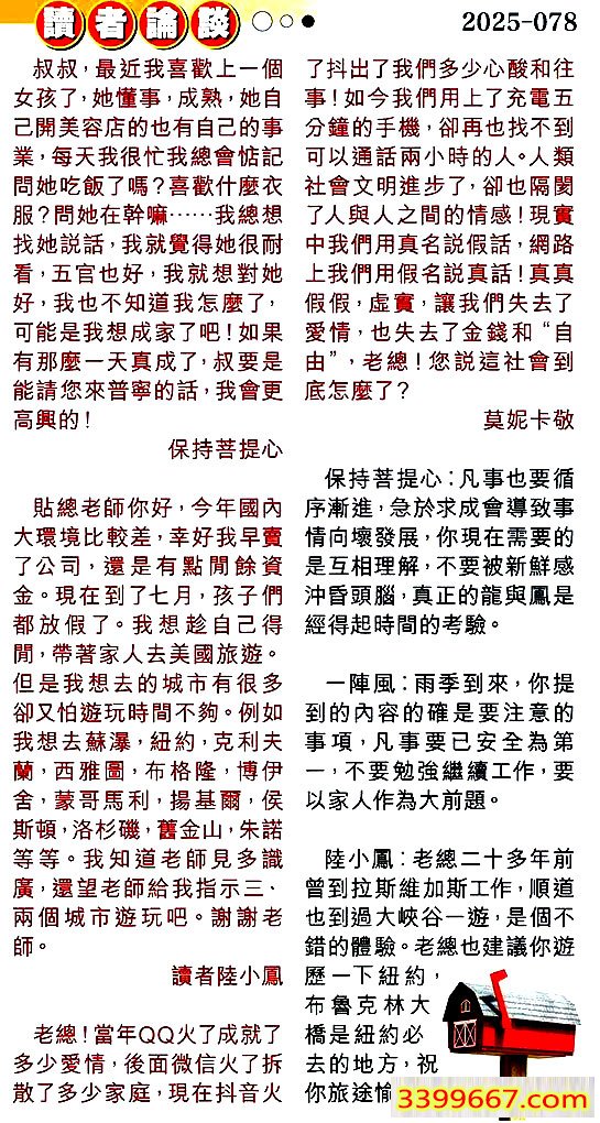 3.老總!當年QQ火了成就了多少愛情,後面微信火了拆散了多少家庭,現在抖音火了抖出了我們多少心酸和往事!如今我們用上了充電五分鐘的手機,卻再也找不到可以通話兩小時的人。人類社會文明進步了,卻也隔閡了人與人之間的情感!現實中我們用真名說假話,網路上我們用假名說真話!真真假假,虛實,讓我們失去了愛情,也失去了金錢和“自由",老總!您說這社會到底怎麼了?====莫妮卡敬