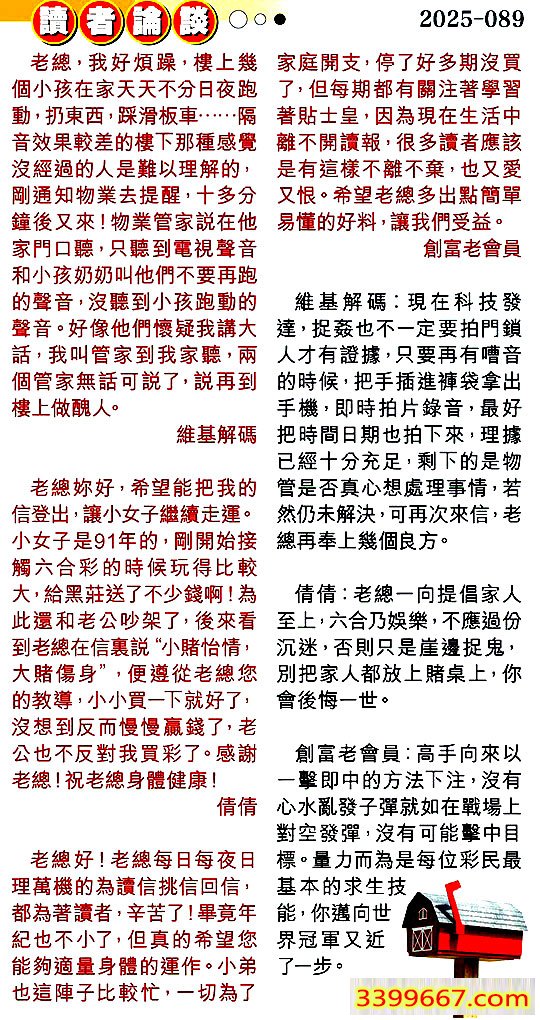 089期:彩民推荐〖貼信讀者論壇〗