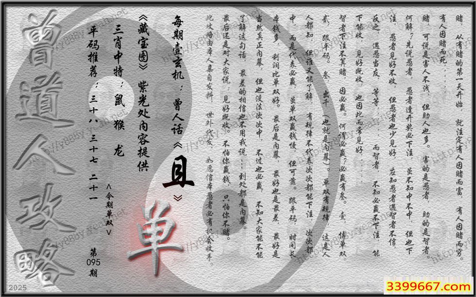 主题 :095期藏寶圖 新:碧落千门锁元气 老:胸中磊落藏伍兵 禁:兔 禁:4尾