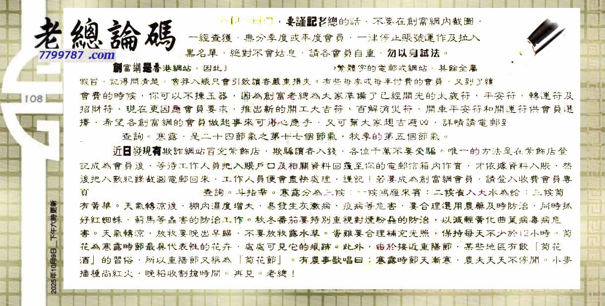 108期:六合皇金句/老总论码/萧公子/林大师/五行夺码/老总信箱截