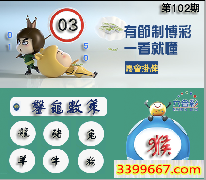 102期正版彩图挂:03 爆:猴 挂牌成语:凿龟数策 挂牌出肖:龙猪兔羊牛狗